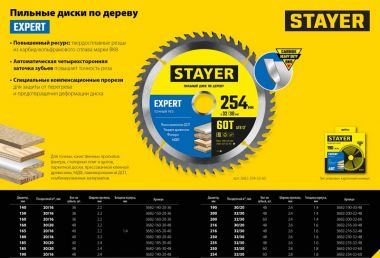 • Диск пильный по дереву STAYER EXPERT 3682-190-30-48_z01, предназначен для продольных и поперечных пропилов фанеры, столярных плит и щитов, паркетной доски, прессованной клееной древесины, МДФ, ламинированной ДСП, комбинированных материалов
