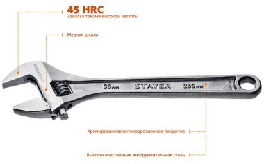 • Ключ разводной STAYER 2725-25_z01, предназначен для монтажа и демонтажа резьбовых соединений с широким диапазоном шестигранных профилей гаек и болтов.